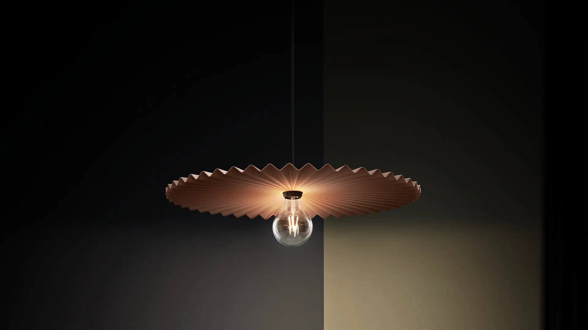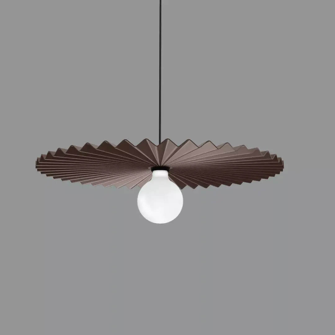Sospensione con corpo in metallo verniciato texturizzato nelle varianti colore bianco, nero, peach, petrol e deep blue. Il rosone in metallo verniciato riprende la colorazione del corpo lampada.